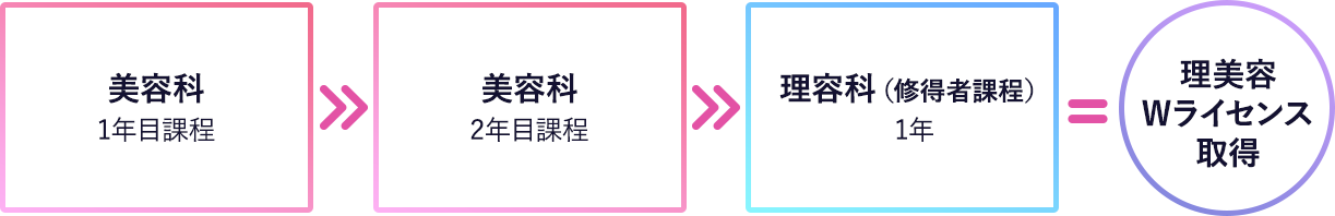 まず2年間、美容科・理容科いずれかの学科で学んで資格を取得した後に、次の資格の取得を目指します。 -